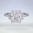 A meticulously crafted platinum three-stone ring, boasting a captivating 3.01-carat radiant cut diamond at its center, elegantly complemented by trapezoid-shaped diamonds totaling 0.53 carats, achieving a total carat weight of 3.54.