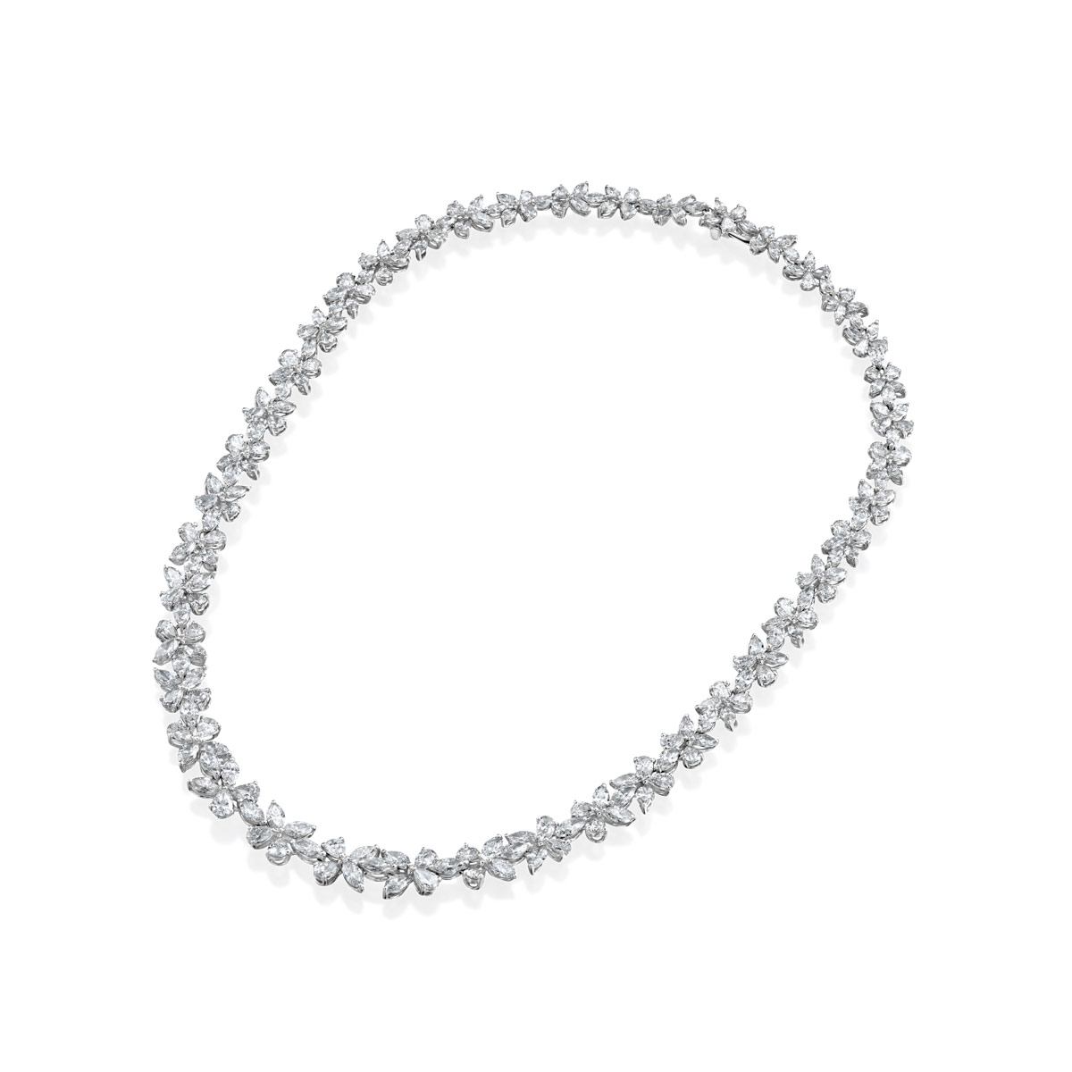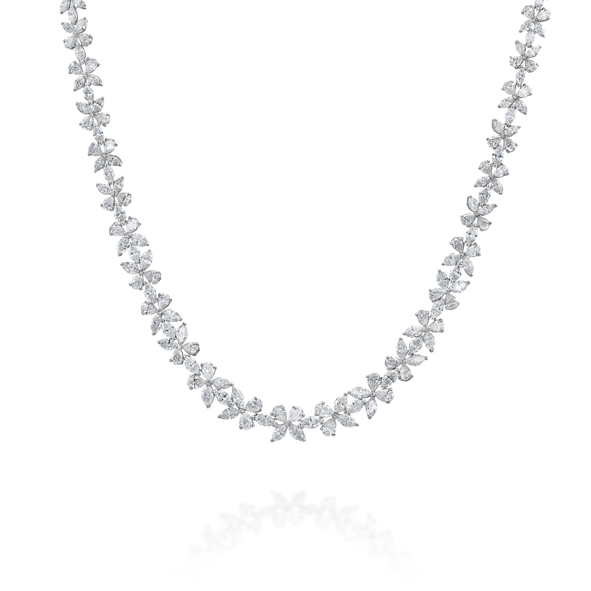 Fleurette necklaces exude a unique and romantic elegance with their artful arrangement of diamond clusters forming delicate floral motifs that gracefully encircle the neck. This extraordinary design features 24.3 carats of alternating marquise and pear-shaped diamonds, meticulously arranged to create enchanting flower-like formations that capture light from every angle. Their unparalleled ability to adorn and illuminate, coupled with their botanical sophistication, makes them a truly captivating and versatile statement piece.