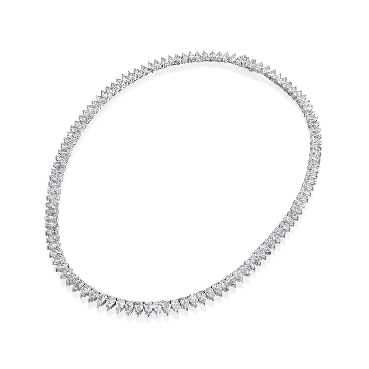 Riviera necklaces exude unparalleled elegance with their stunning display of graduated diamonds, which gracefully encircle the neck. This extraordinary piece features 114 meticulously selected pear-shaped diamonds totaling 29.53 carats, each stone increasing in size as it cascades toward the center, creating a breathtaking focal point. Their ability to capture and reflect light from every angle, coupled with their sophisticated silhouette, makes them a truly captivating and luxurious statement piece.